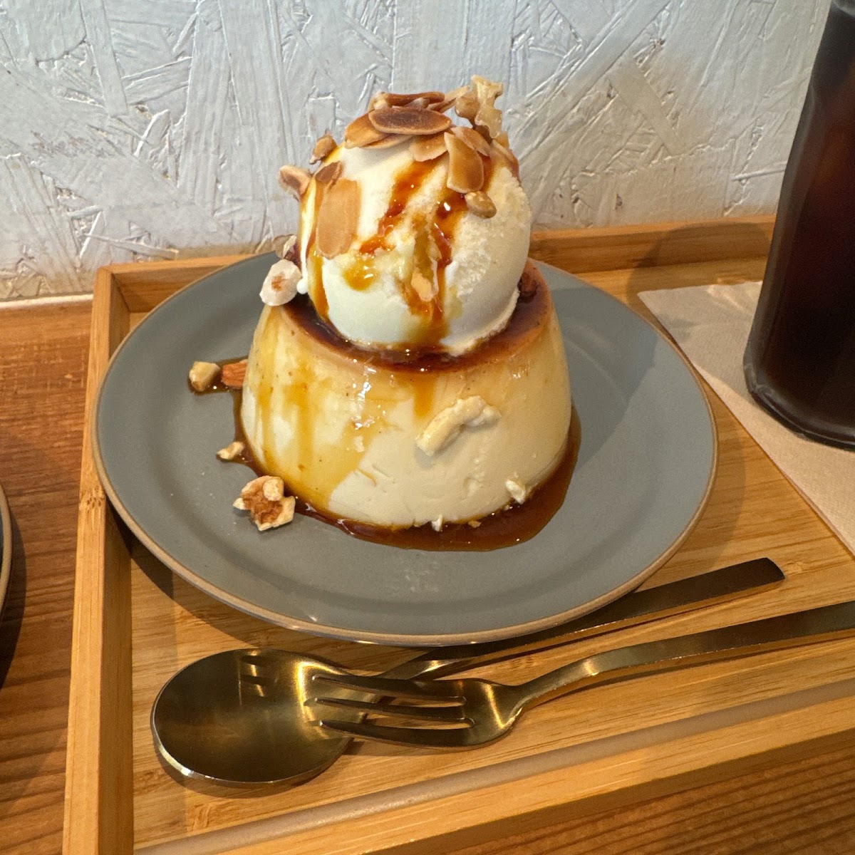 - プリンwithアイス (Pudding with Ice Cream) - A delightful treat that comes in a generous portion, topped with nutty almond and walnut accents. The creamy pudding itself has a subtle flavor that perfectly complements the vanilla ice cream, making it an indulgence you won’t want to miss.